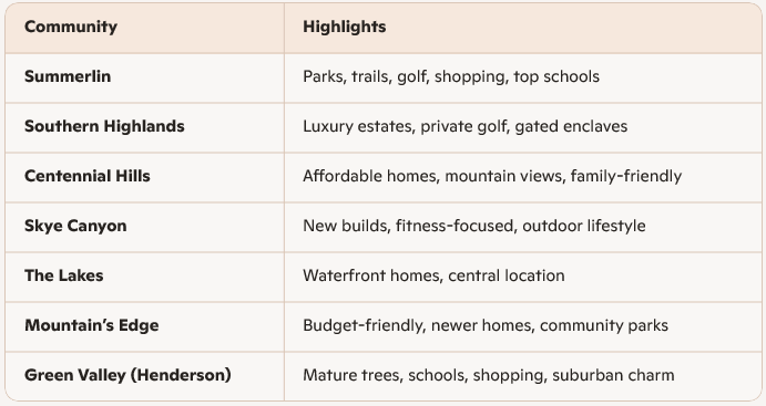 Las Vegas is home to dozens of master-planned communities, each with its own vibe and amenities. Some of the most sought-after areas include: